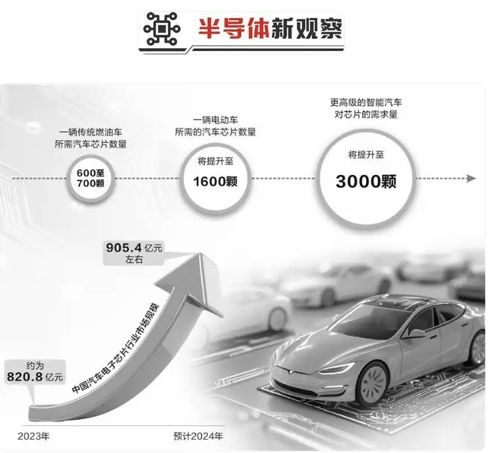 來自中汽協(xié)數(shù)據(jù)顯示,2024年中國新能源(600617)汽車銷量達到1286.6萬輛,同比增長35.5%。相比燃油車,新能源車所需的半導(dǎo)體用量成倍增加。與此同時,中國新能源汽車的智能化水平也在持續(xù)攀升,這些均對汽車智能芯片有著廣泛需求。據(jù)該協(xié)會此前公布的數(shù)據(jù),一輛傳統(tǒng)燃油車所需汽車芯片數(shù)量為600—700顆,一輛電動車所需的汽車芯片數(shù)量將提升至1600顆,而更高級的智能汽車對芯片的需求量將提升至3000顆。