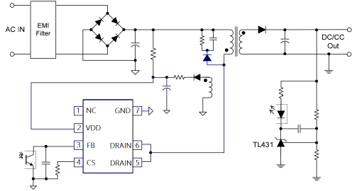 •主要特點(diǎn):數(shù)字頻率變換技術(shù),提高EMI性能。固定65kHz PWM開(kāi)關(guān)頻率。電流感測(cè)前沿消隱。內(nèi)部同步坡度補(bǔ)償。低待機(jī)功耗(<75mW@AC230V);上電時(shí)軟啟動(dòng),降低MOSFET Vds應(yīng)力;全面保護(hù)功能:VCC欠壓鎖滯(UVLO)。VCC的過(guò)電壓保護(hù)(OVP)。逐周期電流限制。過(guò)載保護(hù)(OLP)。過(guò)熱保護(hù)(OTP)。電流限制補(bǔ)償,在通用交流線(xiàn)路輸入中獲得相同的輸出電流。低啟動(dòng)電流(<10uA@VCC=12V);封裝:DIP-7