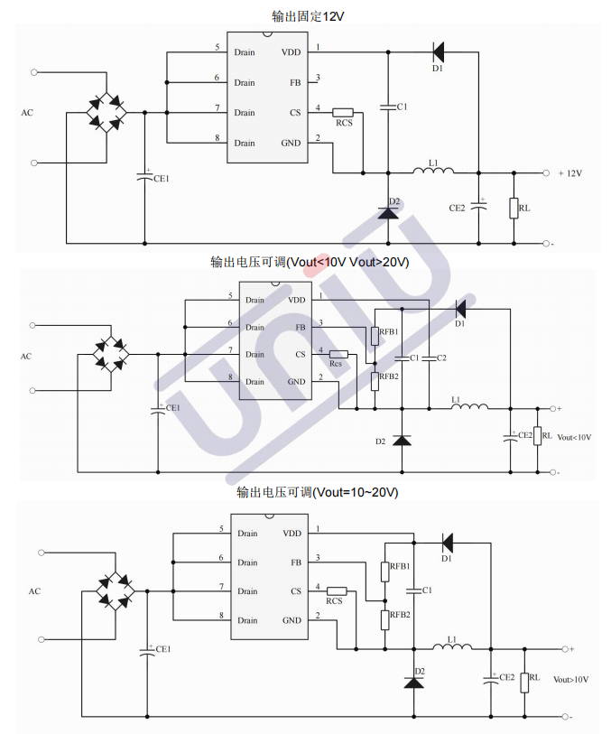•主要特點(diǎn):集成 500V 高壓?jiǎn)?dòng)電路;多模式控制、無(wú)異音工作;支持降壓和升降壓拓?fù)?默認(rèn) 12V 輸出( FB 腳懸空);待機(jī)功耗低于 50mW;良好的線性調(diào)整率和負(fù)載調(diào)整率;集成軟啟動(dòng)電路;內(nèi)部保護(hù)功能 :過(guò)載保護(hù) (OLP);逐周期電流限制 (OCP);輸出過(guò)壓保護(hù) (OVP);VDD 過(guò)壓、欠壓和電壓箝位保護(hù)