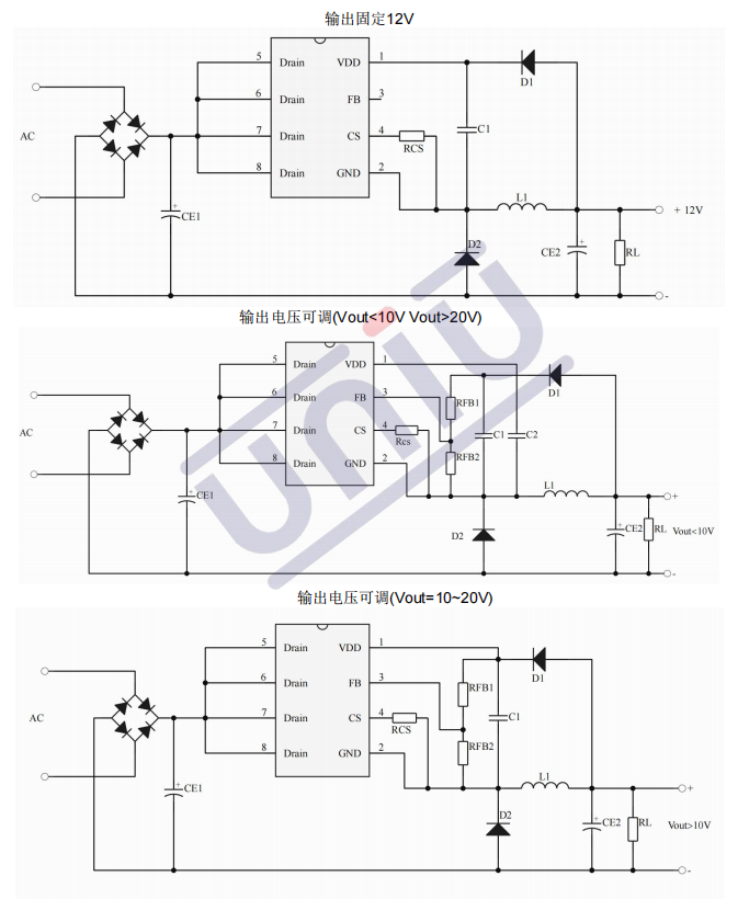 主要特點:集成 500V 高壓啟動電路;多模式控制、無異音工作;支持降壓和升降壓拓?fù)?默認(rèn) 12V 輸出( FB 腳懸空);待機(jī)功耗低于 50mW;良好的線性調(diào)整率和負(fù)載調(diào)整率;集成軟啟動電路;內(nèi)部保護(hù)功能 :過載保護(hù) (OLP);逐周期電流限制 (OCP);輸出過壓保護(hù) (OVP);VDD 過壓、欠壓和電壓箝位保護(hù)