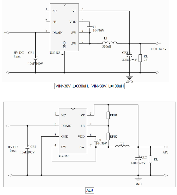 •主要特點(diǎn):VIN: 18~180V(OUT: 14.3V);集成 2.5A 180V MOS;集成 200V 高壓?jiǎn)?dòng)電路;集成續(xù)流二極管;多模式控制、無異音工作;支持降壓和升降壓拓?fù)?默認(rèn)14.3V 輸出;待機(jī)功耗低于 50mw;良好的線性調(diào)整率和負(fù)載調(diào)整率;集成軟啟動(dòng)電路;內(nèi)部保護(hù)功能:過載保護(hù) (OLP);逐周期電流限制(OCP);輸出過壓保護(hù)(OVP);VDD 過壓、欠壓和電壓箝位保護(hù)